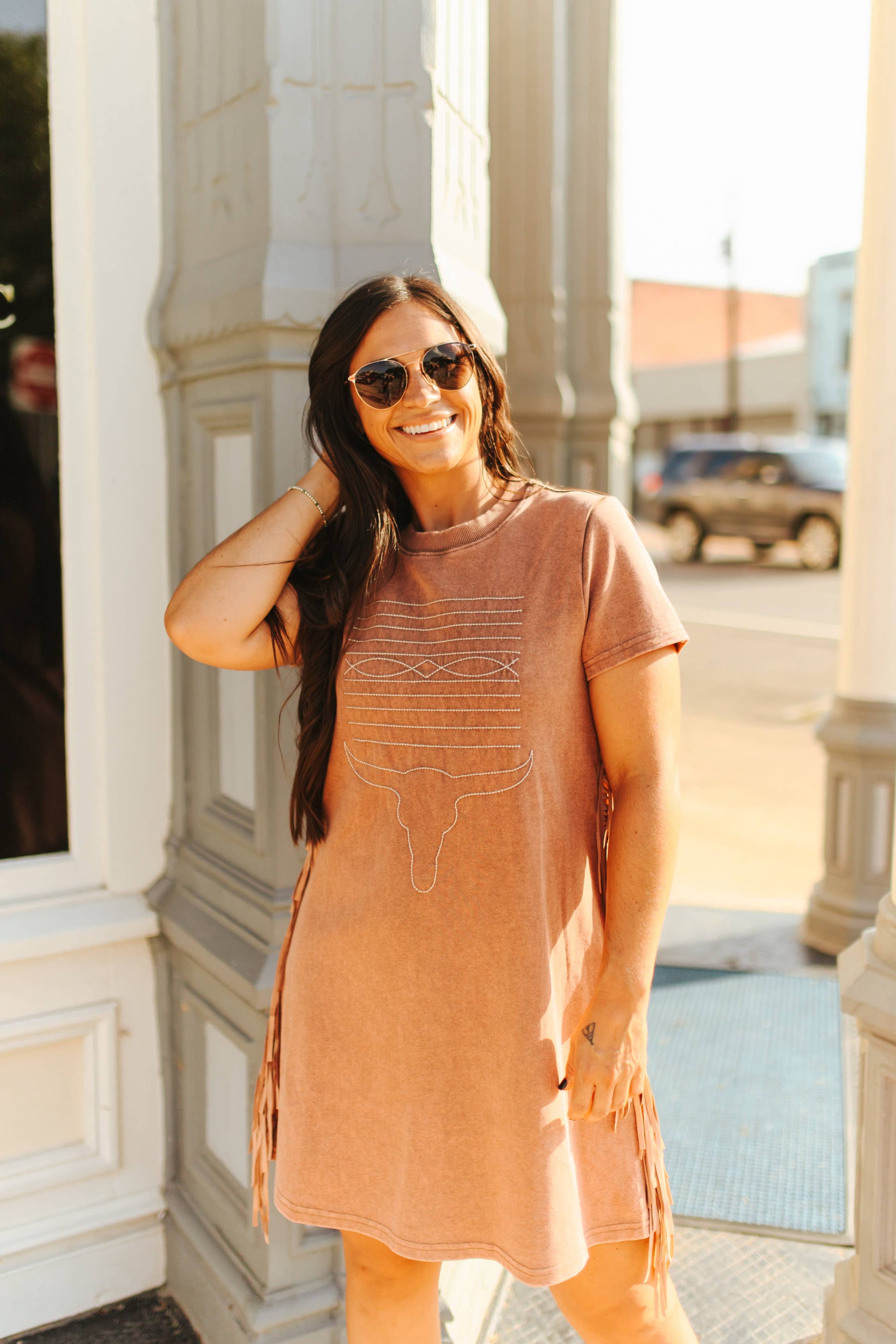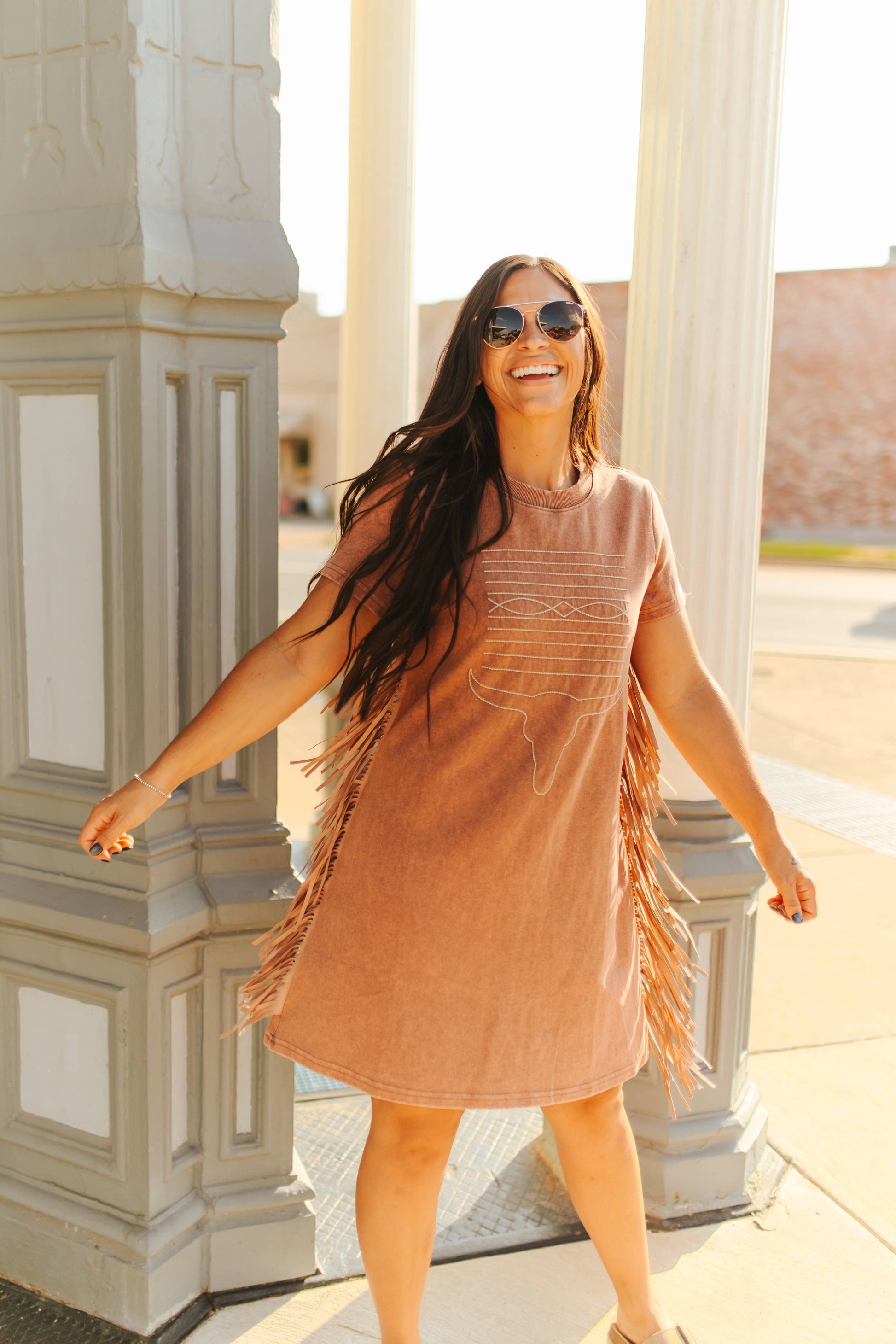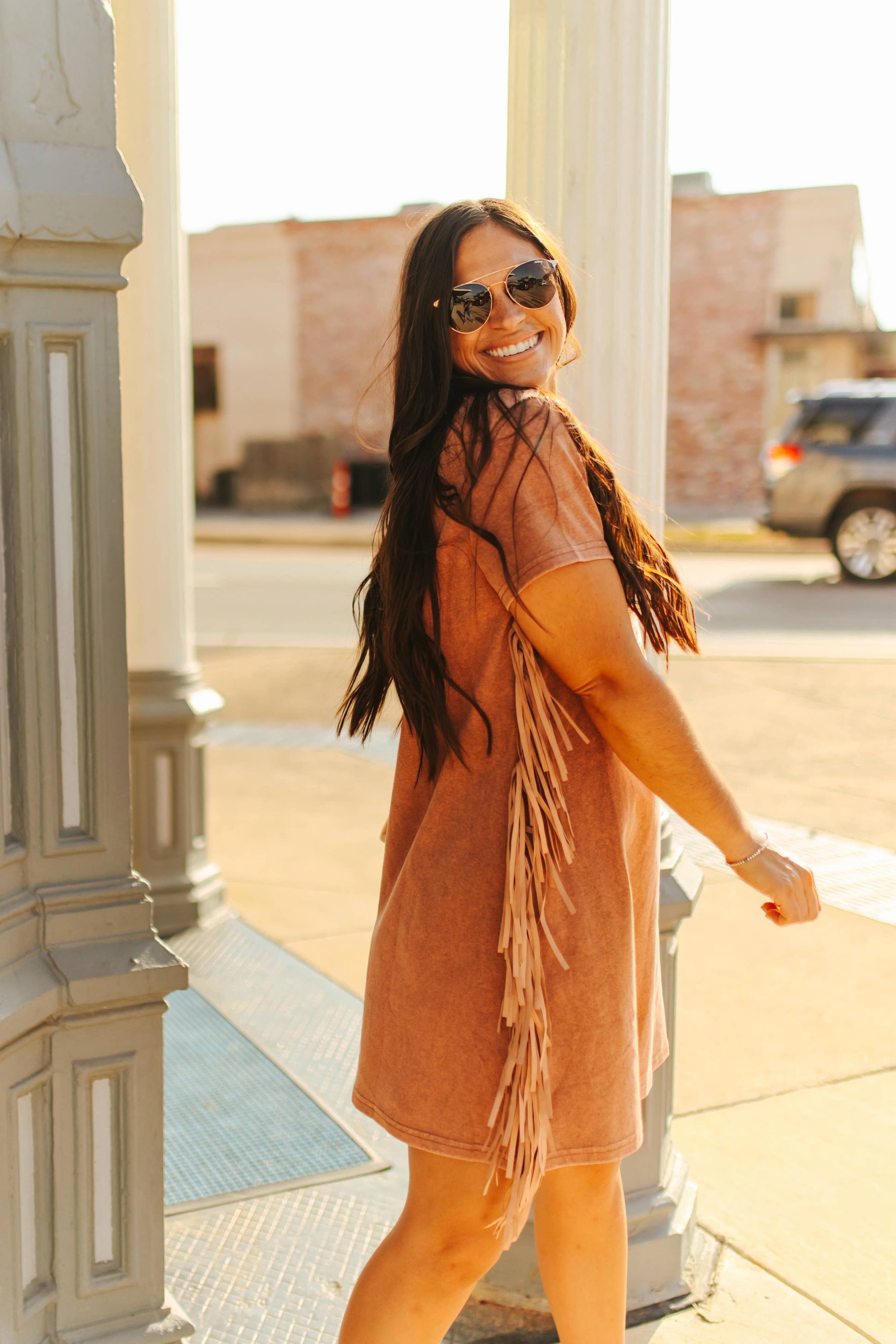 Camel Mineral Wash Dress W Side Fringe